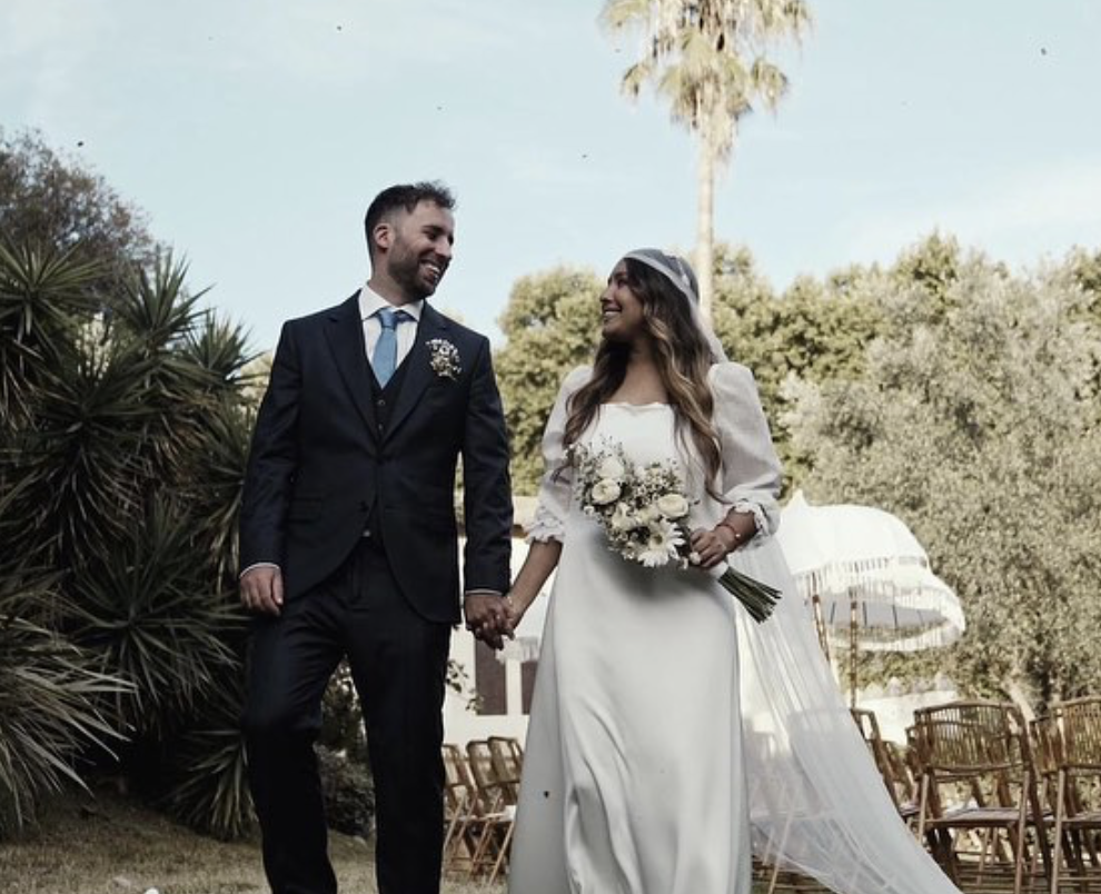 El vestit de núvia de la Giulietta destaca per una línia senzilla on la clau de l’èxit resideix en l’ús de materials de màxima qualitat. En aquest disseny es pot apreciar la brillantor i la textura del crep satinat de Gratacós, una base que sempre és garantia de distinció. A més, hem combinat el teixit amb altres petites joies exclusives del nostre taller Ámala per crear una peça única. Com a detall final, el vel tipus bandana amb flors brodades aporta un toc molt original i actual al conjunt. Moltes gràcies per la teva confiança, Giulietta; ha estat un plaer crear el teu vestit de núvia i compartir un dia tan especial amb tu.